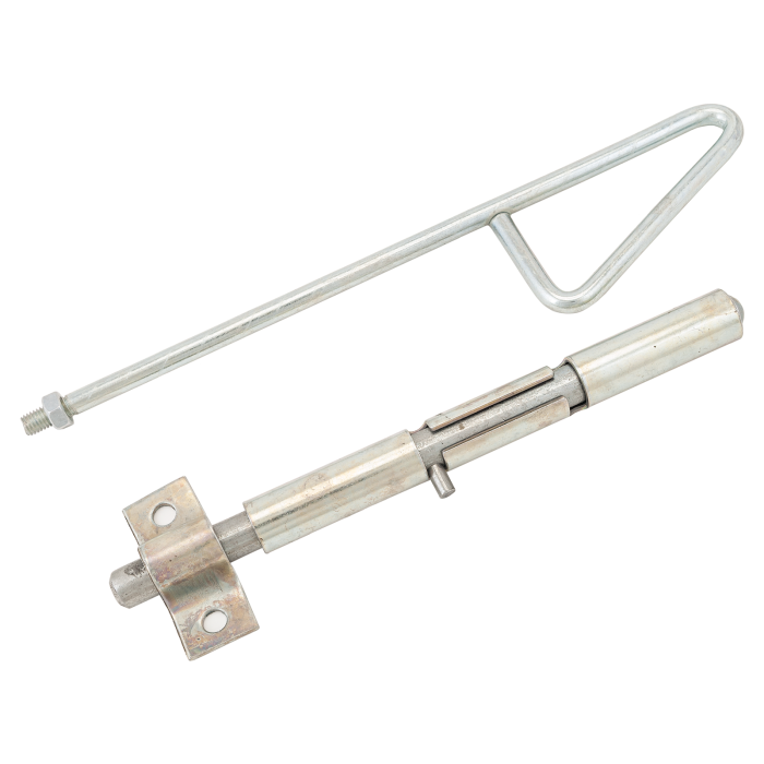 Засов под сварку для металлических дверей. Материал - сталь, полимерное покрытие. Габариты корпуса - диаметр 20 мм, длина 180 мм. Цилиндрический ригель диаметром 13 мм с вылетом 50 мм. В комплекте ответная планка 65х25 мм, удлиненный стержень-рукоятка для движения ригеля.