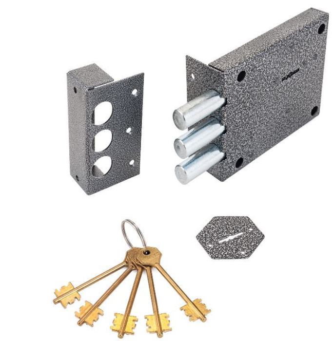 Замок накладной сувальдный. Предназначен для установки на металлические двери. Засов из трех цилиндрических ригелей диаметром 20 мм, с максимальным вылетом 42 мм. Удаление ключевого отверстия - 87 мм. Габариты замка - 142х122х26 мм. Комплектация - 5 ключа, накладка, ответная пластина.